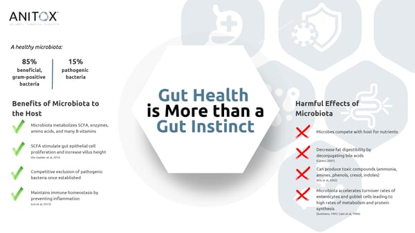 A healthy microbiota: 85% 15% beneficial, pathogenic gram-positive bacteria bacteria Gut Health Benefits of Microbiota to Harmful Effects of the Host Microbiota is More than a Microbiota metabolizes SCFA, enzymes, Gut Instinct amino acids, and many B vitamins Microbes compete with host for nutrients SCFA stimulate gut epithelial cell Decrease fat digestibility by proliferation and increase villus height deconjugating bile acids (De Vadder et al, 2014 (Gaskin, 2001) Can produce toxic compounds (ammonia, Competitive exclusion of pathogenic amines, phenols, cresol, indoles) bacteria once established (Klis et al, 2002) Microbiota accelerates turnover rates of Maintains immune homeostasis by enterocytes and goblet cells leading to preventing inflammation high rates of metabolism and protein (Lei et al, 2015) synthesis (Summers, 1991; Cant et al, 1996)